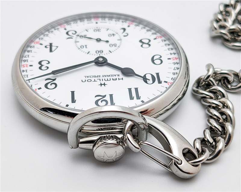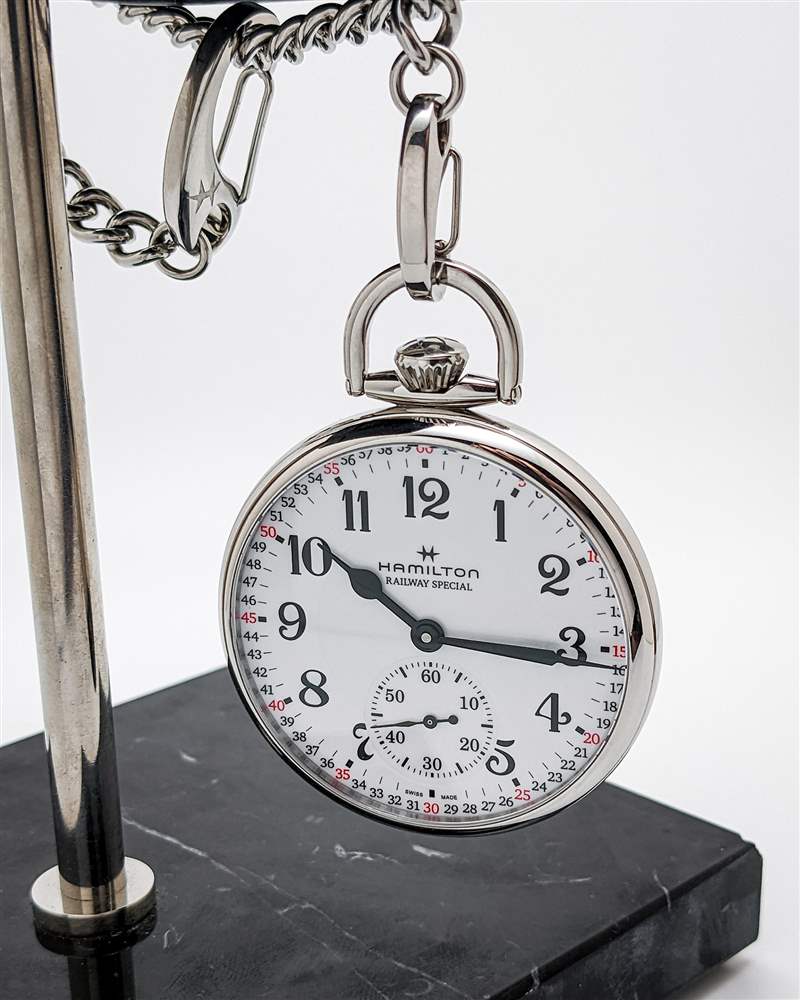 Hamilton 為鐵路懷表配備 ETA 6497-1 手動上鏈機芯。自 60 年代推出以來,6497-1 一直是懷表和腕表生產的中流砥柱,憑借其老派的 18,000 bph 節拍率,它在實踐中捕捉了早期鐵路手表的精神。該機芯還提供穩定的 50 小時動力儲存,但奇怪的是(尤其是對于高精度鐵路計時應用)不會出現故障。然而,在我們的測試期間,6497-1 在精度方面表現出色,平均每天僅 +4 秒。Hamilton 為這款鐵路懷表配上相配的不銹鋼鏈條。雖然簽名的登山扣式端夾在這里可能有點過時,但鏈條堅固且易于固定到皮帶環、夾克口袋、廣告留言廣告信息結束