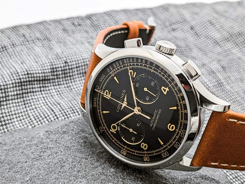 與安靜成長(zhǎng)的 30 年代/40 年代計(jì)時(shí)碼表領(lǐng)域中的大多數(shù)競(jìng)爭(zhēng)對(duì)手相比,浪琴表 Record Heritage 提供了非常干凈和內(nèi)斂的表盤(pán)設(shè)計(jì)。浪琴 (Longines) 對(duì)復(fù)古風(fēng)格的啞光黑色表盤(pán)并不陌生,Record Heritage 表盤(pán)光滑、均勻的飾面賦予其干凈、經(jīng)典的外觀,而不會(huì)給人以古銅色的印象。話(huà)雖如此,由于其小表盤(pán)刻度、徽標(biāo)以及測(cè)速計(jì)刻度和計(jì)時(shí)碼表秒軌道的雙外圈的鍍金表盤(pán)文字,表盤(pán)仍然提供了充足的視覺(jué)溫暖。在保持 40 年代的設(shè)計(jì)感及其迷人的視覺(jué)復(fù)雜性的同時(shí),這些外部刻度還將表盤(pán)設(shè)計(jì)的其余部分壓縮到更小的區(qū)域,進(jìn)一步增強(qiáng)手腕上的緊湊感。然而,真正吸引眼球的是金色表盤(pán)硬件。實(shí)用的阿拉伯?dāng)?shù)字和楔形索引的組合明亮而迷人的老式風(fēng)格,優(yōu)雅纖薄的葉子手機(jī)也是如此。雙凹陷子表盤(pán)周?chē)慕鹕b飾環(huán)讓 Record Heritage 在手腕上看起來(lái)更加閃亮,同時(shí)自然地將眼睛吸引到那里的關(guān)鍵信息。Longines 選擇用 azurage 完成這些子表盤(pán),讓大部分啞光設(shè)計(jì)在不斷變化的光線(xiàn)下也有一點(diǎn)活力。盡管整體布局優(yōu)雅、精致且視覺(jué)平衡令人印象深刻,但 Record Heritage 的易讀性可能是愛(ài)好者爭(zhēng)論的焦點(diǎn)。精美印刷的計(jì)時(shí)秒針刻度,葉子聽(tīng)筒的纖細(xì)尖端,