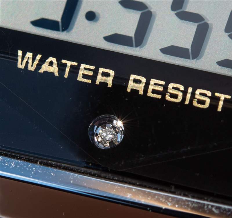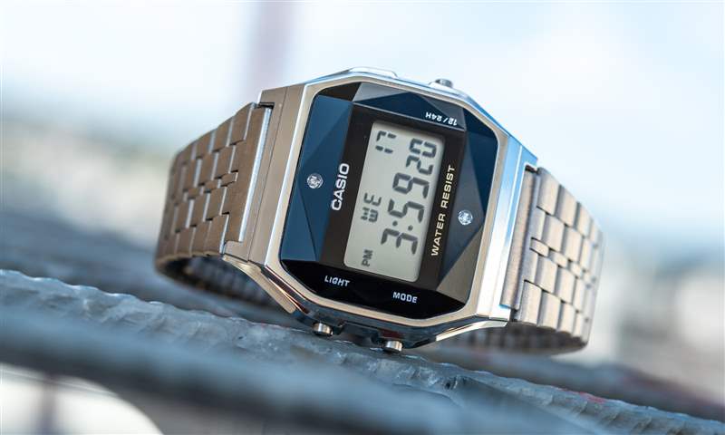 好吧,我們已經(jīng)到了鉆石的時(shí)候了。因?yàn)檫@款手表最有趣的地方并不在于它驚人的易讀性或可接受的手腕感覺。它是這個(gè)特定的卡西歐 A159WAD-1D 參考型號(hào)(以及其他三個(gè)型號(hào),其金色替代品 A159WGED-1 和兩個(gè)較小的版本,即 LA670WEAD-1EF 和 LA-670WGAD-1D)的獨(dú)特之處:兩顆鉆石顯示相當(dāng)顯眼地位于顯示屏的上方和下方,在以模仿鉆石的方式刻面的前玻璃元件下方。