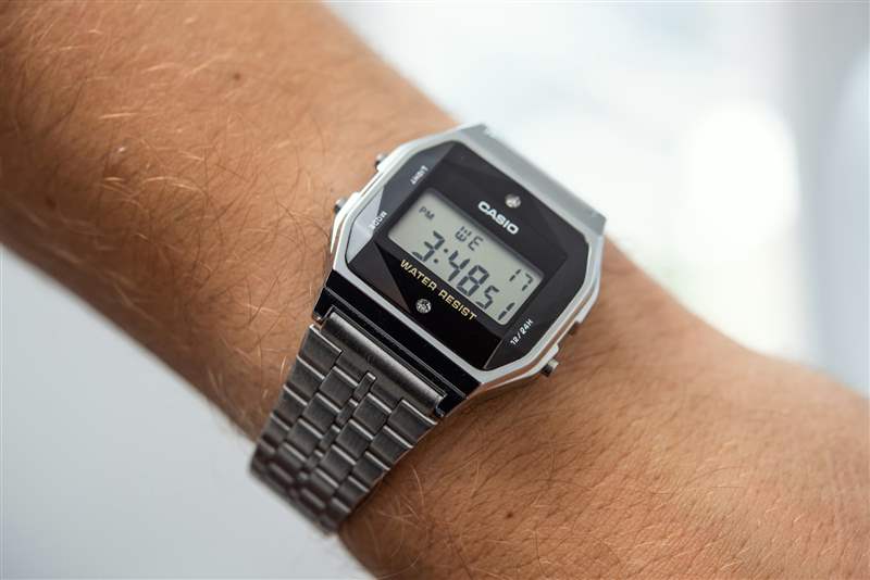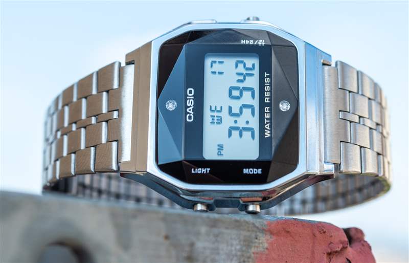 佩戴卡西歐 A159WAD-1D 時(shí),它的多面前玻璃(忘掉藍(lán)寶石水晶,它是粗糙的“樹脂玻璃”)看起來幾乎一樣有趣,因?yàn)樗噲D捕捉其中一個(gè)面的光線鉆石。盡管它們位于前面玻璃后面的較低位置,但仍有機(jī)會(huì)不僅在頂刻面(稱為臺(tái)面),而且在傾斜的刻面行(稱為表冠)上捕捉到反射。相對(duì)較小的外殼在我 6.8 英寸(17 厘米)的手腕周長下看起來不錯(cuò),而玻璃和邊框之間的反射以及黑色顯示屏環(huán)繞和文本之間的平衡都得到了很好的管理。
