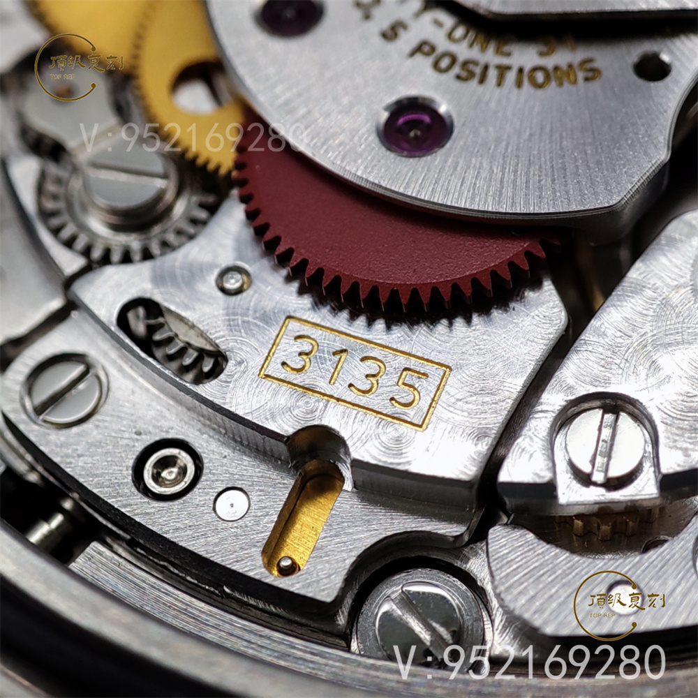 細節做工到位,整表看上去十分精致。機芯采用3135VS獨家機芯,基本無返修。機芯的做工精密度,機芯外觀差別大家平時看不見。但是機芯加工的水準差別,其本質是機芯制造工廠實力的差別,工廠的加工設備、技術人員的差別。如果連外觀簡單的銑花工藝都處理不好的工廠,你們能相信這種工廠能夠制造出高精度、質量穩定的機芯嗎?不能夠吧。就像很多國產汽車,如果連車殼細節質量都做不好的車企,能造好國產發動機幾乎沒有。這種水準差距,決定了其產品的水準和質量。VS此款3135機芯,甲板的銑花工藝以及太陽紋打磨做出了原裝的效果,且修改了機芯的結構,拆散重裝依舊穩定。