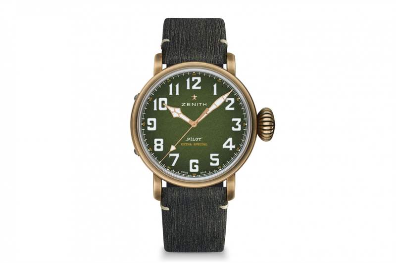 軍表的其中一個黃金組合,就是青銅表殼加綠色表盤,Zenith這枚飛行軍表便是這個設計,粗獷軍味即使升華!銅殼最有趣好玩的地方,就是表殼接觸空氣、濕氣和熱力后,會自然產生帶有保護性的氧化層,在表殼表面形成一層綠銹,防止表殼氧化。所以隨著時間流逝,每個表殼都變得獨一無二,真真正正見證住歲月痕跡。想戴一枚有風霜痕跡的軍表,可考慮這枚。