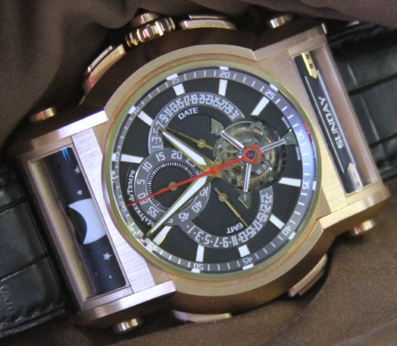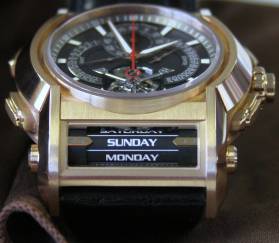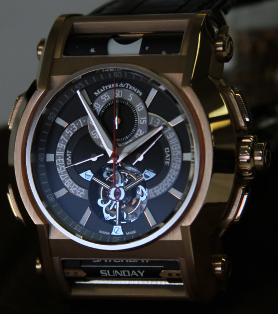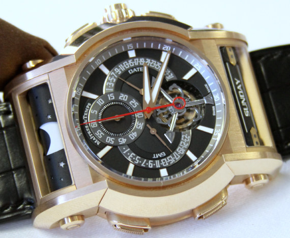 第一章圓形腕表的表盤實際上已經“四舍五入”。它現在具有更主流的外觀,并且更容易閱讀。指針上的Lume使它們與表盤形成更好的對比,并與小時標記相匹配。這些取代了原版上的羅馬數字小時標記。雖然外觀不那么宏偉,但第一章圓形的表盤更容易閱讀。其中包括時間以及其他功能,如日期、格林尼治標準時間指針和單按鈕計時碼表。不要忘記表盤上的外露陀飛輪。如果表盤感覺有點缺乏情感,那么表殼肯定不會。你可以看到設計師Christophe Claret和Peter Speake-Marin在這里大放異彩。對我來說,這個設計看起來像是他們兩個個性的真正融合。我認為用于月相和星期幾的鋁制圓柱滾輪集成得非常好。夸張的角度和堅固的外觀特征遍布整個表殼,使其外觀自豪。它也是彎曲的,適合你的手腕。