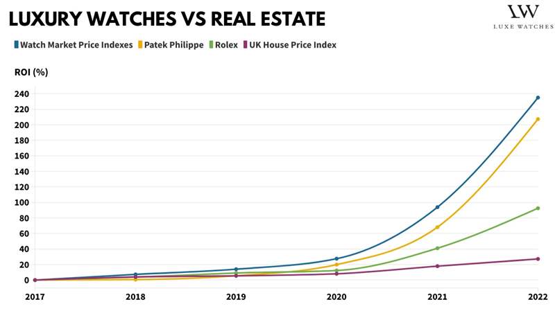 財經專家將手表市場與英國房價指數(該指數計算每月平均房價變化)進行比較時,可以我們在投資熱門手表和投資房地產的兩種方式上得到準確的結論。