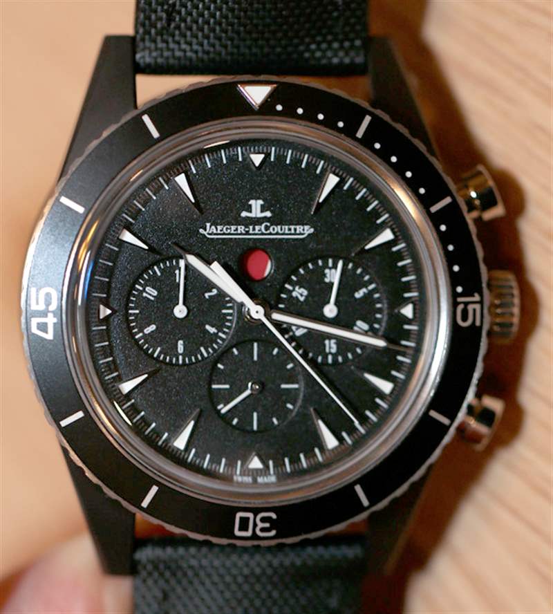 2012年還有一款積家深海計時表,2013年的版本有一些小的改動。機芯相同,但金屬陶瓷表殼結構和尺寸不同。去年的Deep Sea Chronograph 腕表寬度為42 毫米,2013 年的金屬陶瓷版本為44 毫米。我個人更喜歡大尺寸,但我知道很多人想要更小的 40 或 42 毫米運動手表。44 毫米是一個很好的尺寸,提供現代外觀和深海計時碼表著名的復古風格。作為一名潛水員,這不是超深潛水,但這在很大程度上與它具有計時功能有關——因此防水深度為 100 米。