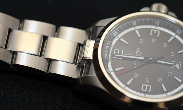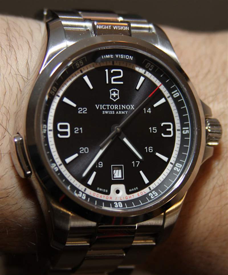 Victorinox Swiss Army 提供兩種表盤顏色(淺色或深色)的夜視儀,并配備鋼表鏈或皮革表帶。我認為大多數瑞士軍迷都會想要像樣的手鐲。寬手鐲很保守,有助于防止手表看起來太小。它具有蝴蝶式展開裝置和安全扣。它不是高端感覺的縮影,但關閉時非常堅固。沒有什么比一個脆弱的扣環更糟糕的了。