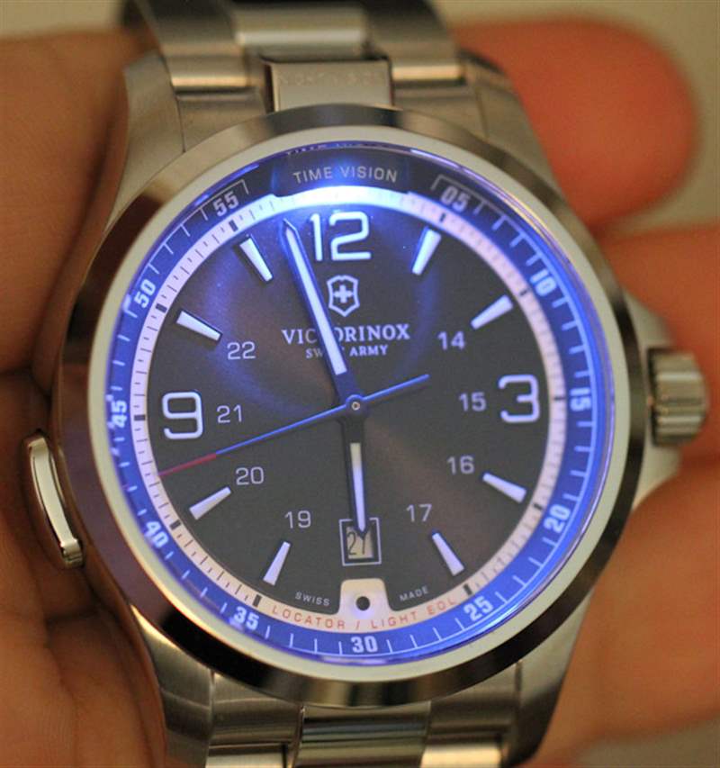閃爍的紅色 LED 燈是 Night Vision 手表上的三個 LED 燈之一。第二個位于手表另一側 12 點鐘位置的旁邊。這是一個藍色 LED,具有點亮表盤的獨特功能。只需按一下燈按鈕即可激活此燈幾秒鐘,時間足以讀取表盤。Victorinox Swiss Army 在指針和時標上也放置了發光體,這是一些受歡迎的冗余。這意味著即使沒有激活藍色 LED 燈,您也很有可能能夠在弱光下閱讀手表。與現在用于在黑暗中照亮手表表盤的其他一些 LED 燈不同,夜視儀上的 LED 燈效果非常好,可以提供完整的表盤視圖。其他設計欠佳的手表的 LED 無法提供足夠的光線?!癟ime Vision”這個標簽相當直接地定義了它結束的光的目的 – 當你大聲說出來時有點迷人俗氣。地獄,我也想要“時間愿景”。