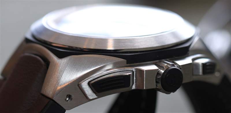 芝柏 Chrono Hawk 腕表寬 44 毫米,采用棱角分明的精鋼表殼,同時融合了老款 Laureato 腕表和上一代 Sea Hawk 的設計元素。但是,也有一些新的東西。首先是表殼弧形計時碼表按鈕,這讓我想起了 Audemars Piguet Royal Oak Chronograph 型號上的許多新按鈕。表殼和表圈之間有黑色橡膠環,以及整個黑色橡膠飾邊。