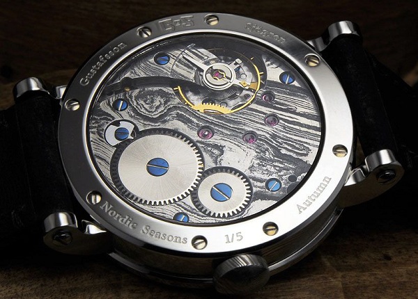 每款 Nordic Seasons 手表的表殼寬 44 毫米,主要采用大馬士革鋼制成。這包括中間的發(fā)條盒、表圈和表冠。表盤(pán)顯然也是用大馬士革鋼制成的。奇怪的是,GoS 給我的機(jī)芯圖片顯示了瑞士 ETA UNITAS 6498 庫(kù)存,沒(méi)有 GoS 生產(chǎn)的特殊大馬士革鋼橋。技術(shù)規(guī)格表明,Winter 手表實(shí)際上在 6498 手動(dòng)上鏈機(jī)芯上配備了 GoS 橋,該機(jī)芯經(jīng)過(guò) Soprod 調(diào)整以提高準(zhǔn)確性和質(zhì)量。下面是 Nordic Seasons Autumn 表底蓋的圖片,以供參考機(jī)芯應(yīng)該是什么樣子。等等,現(xiàn)在我仔細(xì)觀察,我認(rèn)為帶有大馬士革鋼橋的 UNITAS 6498 是一個(gè)選擇。奇怪的是,在一件如此有限的作品上有選擇權(quán)。哦,