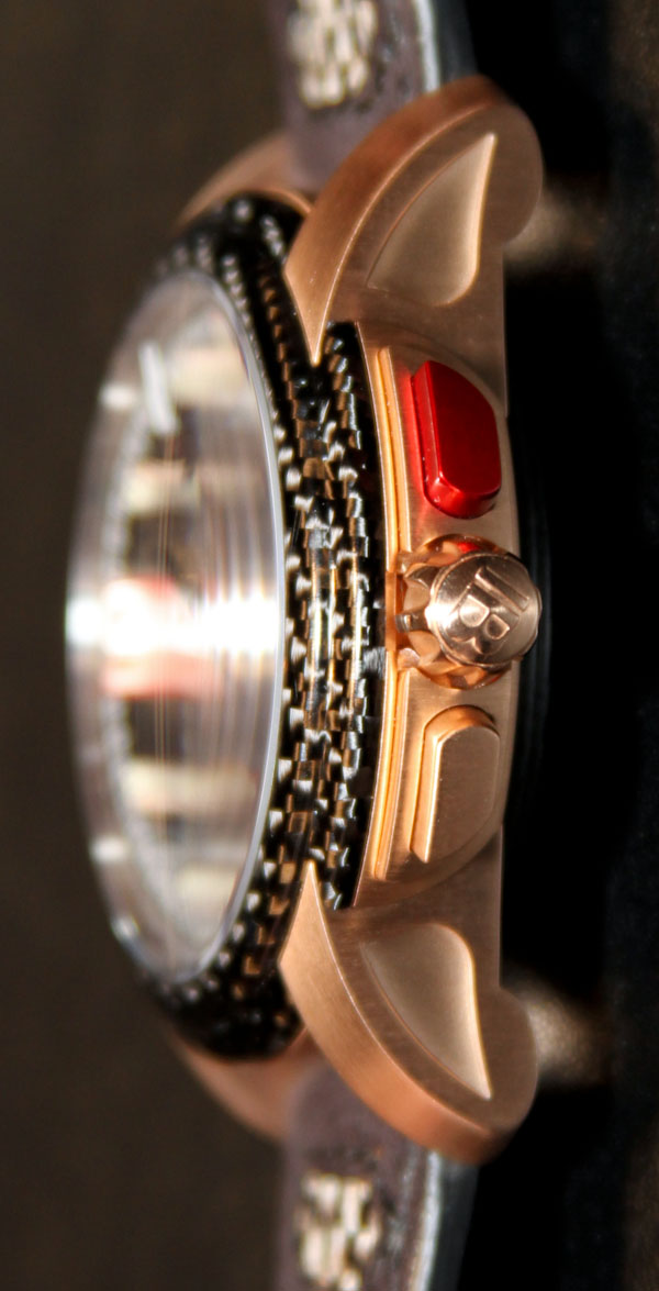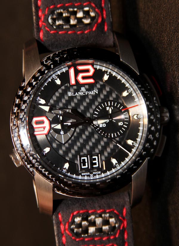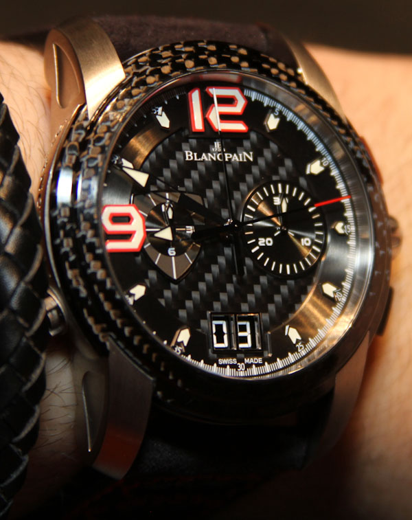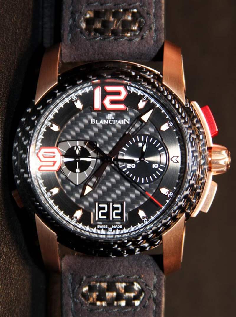 L-Evolution 雙秒追針飛返計時碼表表殼做工精美,有輕度(緞面)拉絲 18k 紅金或白金可供選擇。我認(rèn)為選擇鈦金屬表殼會很有意義。表殼寬 43 毫米(防水深度達(dá) 100 米),包括與碳纖維表盤和表帶中的碳纖維元素相匹配的碳纖維表圈。這是很長一段時間以來(也許是有史以來)我第一次看到像碳纖維這樣的東西與黃金相匹配。與其他一些寶珀 L-Evolution 運(yùn)動手表的一些極度不平衡的表盤不同,這款手表相對平衡且具有吸引力。如此之多以至于奇怪的大“9”和“12”點鐘小時指示器并沒有那么令人反感。