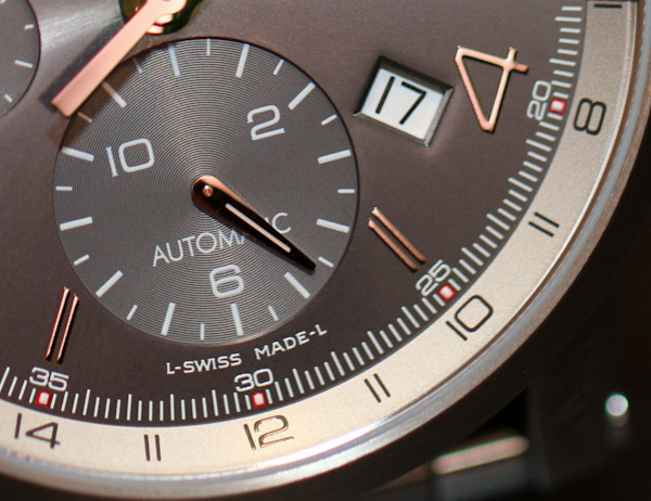 這款 Timewalker ChronoVoyager UTC 手表擁有旭日紋拋光鍍銀表盤和玫瑰金色指針和時標。表盤上的一些東西在我看來也有點褐色。這可能是在表盤上加入了金色元素或略帶褐色的色調。表盤的法蘭環是傾斜的,具有 GMT 指針的 24 小時時間刻度。一個有趣的細節是“日/夜”指示器在圓環上的非均勻放置。更準確地說,GMT 刻度從晚上 7 點到早上 7 點是黑暗的——在其他具有類似雙音刻度的手表上通常是下午 6 點到早上 6 點。