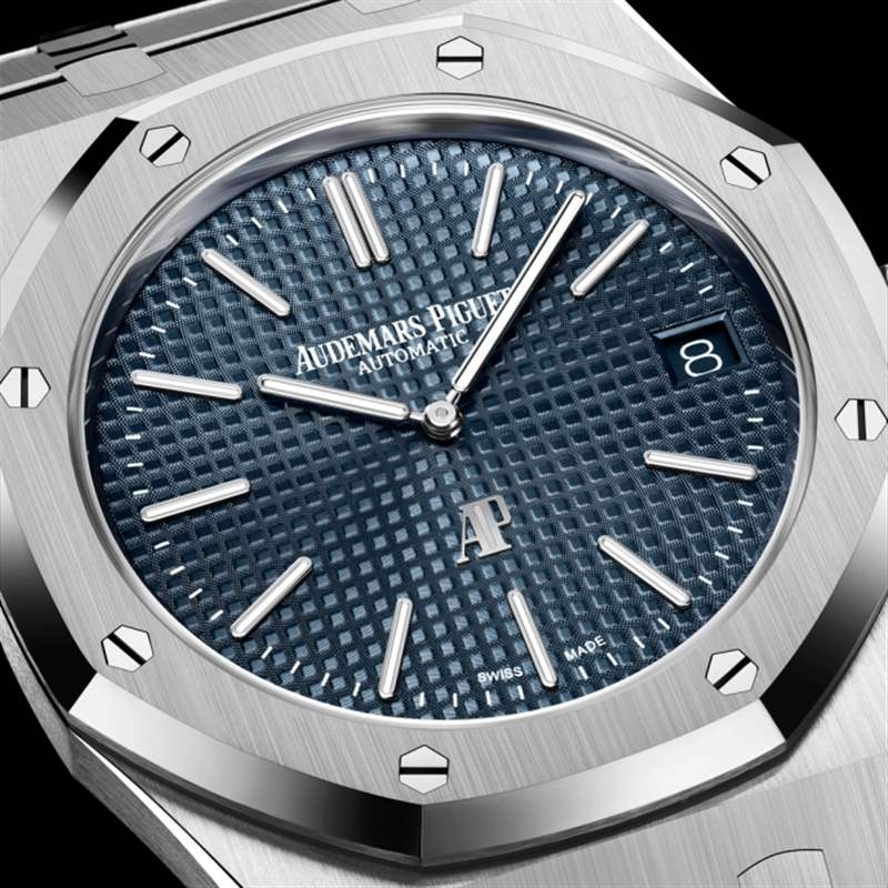37mm尺寸型號也迎來新一代表款,一眾新表在保留1972年原創設計之余,表殼、表盤及表帶稍稍微調設計。主要改動包括表殼上下方的斜面加大,令整體比例達至更佳的效果,同時增強手工緞面打磨與亮面拋光互相輝映的光影效果。與表殼一體成型的表帶也重新設計,首四個鏈節從平行四邊形改為梯形,表帶寬度逐步遞減,令線條更優美;所有鏈節也造得更纖薄,令表帶更輕盈,最后將底蓋進一步整合到表殼中,令佩戴起來服貼舒適,更貼合手腕弧度。全新的Royal Oak Selfwinding 37mm備有「云夜藍50」面、白面、灰面,以及近來大熱的冰藍面。