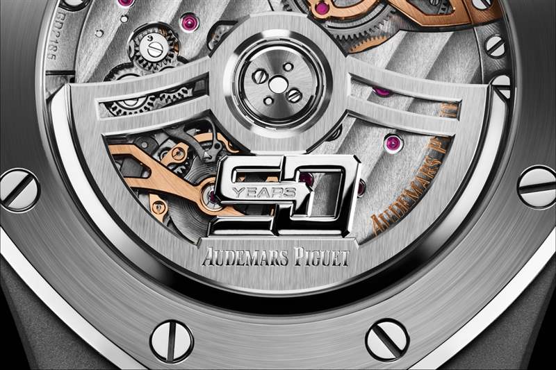 而作為50周年版,表背當然設有記念細節,自動擺陀鏤空成可見「50 YEARS」字樣,并跟表殼一樣經過緞面打磨與拋光倒角交錯處理。而周年紀念款采用與表殼同色的擺陀,這通常是AP復雜表獨享的配搭組合。要說明,也只有今年出產的腕表,表背才有這個「50」周年標記,下年才購入的Royal Oak,就不會有這周年紀念擺陀。所以今年的RO表款收藏價值有多高,相信不用解釋。