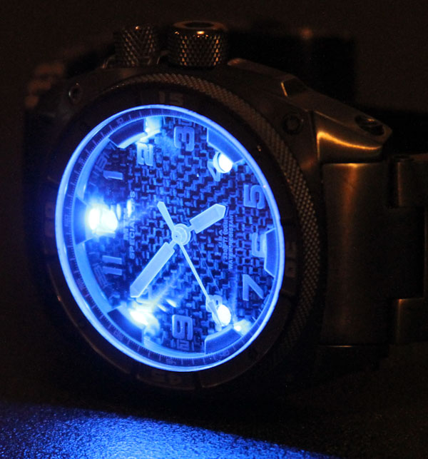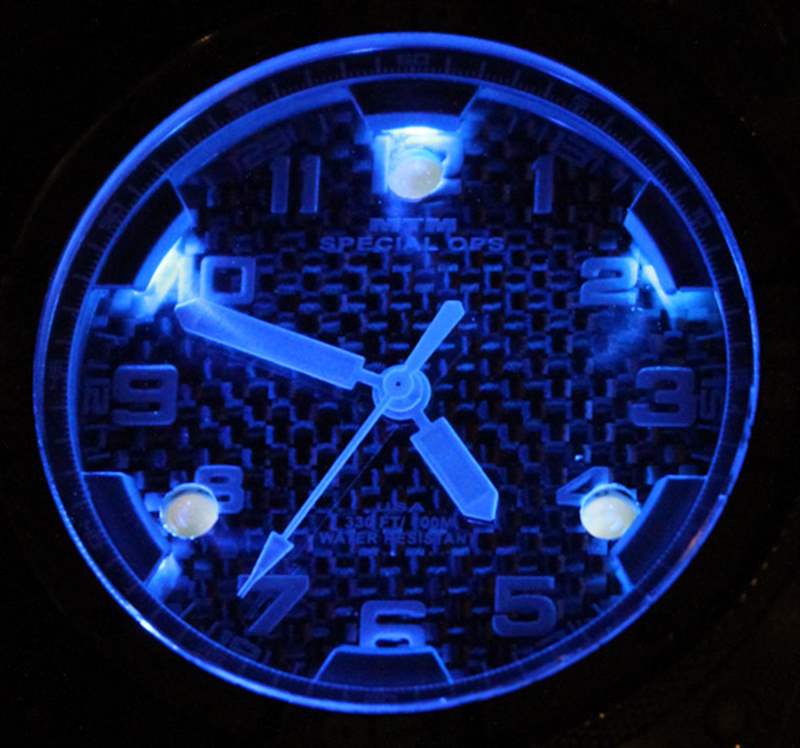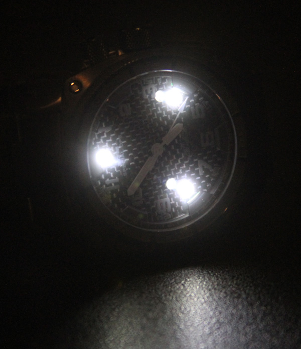 想看得更清楚嗎?然后擰下位于 2 點鐘位置的第二個表冠以激活 LED 燈系統。表盤右側是三個可以發出藍光或白光的 LED。根據 MTM,有五種不同的燈光模式。基本上“開啟”20 秒或開啟另一種模式,直到電池電量耗盡——兩種顏色均適用。第五個模式是白光的頻閃效果??紤]到它們來自手表表盤,這些燈的亮度確實令人印象深刻。藍光不那么強大,基本上是為了讓你在黑暗中輕松看清表盤而設計的。白光旨在提供適度的區域照明以及從遠處可見。你不會用它照亮一個房間,但它足以照亮你面前的物體,閱讀文件,并看到地面。充滿電后,MTM 聲稱可以使用幾個小時。