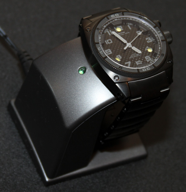 按下上推桿會在燈光模式之間循環。它鎖定的事實很有幫助,這樣您就不會意外打開它并浪費電池。手表內部裝有可充電鋰離子電池。老實說,我不確定手表里有一塊電池還是兩塊電池(一塊用于計時,一塊用于照明)。MTM 將電池壽命定為 10 年,這對于只需要為石英計時裝置供電的鋰離子電池來說很常見。我的假設是這件作品中有兩節電池。我所知道的是,Falcon 手表在設計時就考慮到了易于充電的問題。該套件隨附一個用于 Falcon 的感應充電座。使用 A/C 適配器,只需將手表放在底座上幾個小時即可為手表充電。如果不使用燈,電池可能會持續很長時間。考慮到“幾個小時的電池壽命”,最好隨身攜帶充電器,或者如果您打算離開充電器超過幾周并認為您會經常使用光線。MTM專門開發了這個系統,考慮到你需要給它充電,使用起來是想象中的方便。LED 可能比傳統燈泡消耗更少的功率,但在如此明亮的情況下仍然是口渴的小燈。