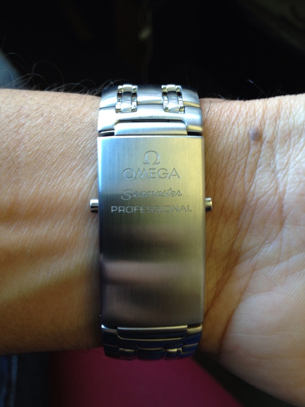 許多鏈接使手鏈可以輕松環繞在手腕上。Omega 的展開式表扣易于使用且佩戴穩固。表扣采用拉絲精鋼制成,帶有歐米茄標志和名稱以及海馬印章。這里的一個缺點是大帶扣確實有劃傷的傾向……潛水員的延伸部分也存在,允許將手鏈延長約 5 毫米,以便適合潛水服。