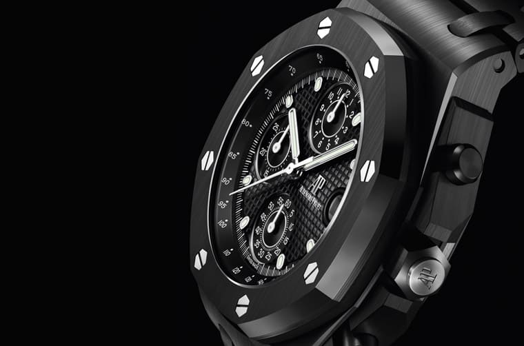 ▲復刻味強烈的皇家橡樹離岸型自動上鏈計時碼表2023年首度以黑色陶瓷制作表殼與鏈帶。