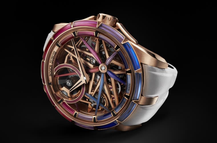 表款本身的外觀、功能與機芯都與其他王者系列單擺輪手表相同,不過這次品牌特別在表圈與面盤鑲上漸層彩色的尖晶石,色彩呈現從紅色到藍色的過渡性,而且羅杰杜彼還在尖晶石部分加上Super-LumiNova夜光涂層,如此一來表款無論在白天、黑夜或紫外光下,表圈與面盤上的尖晶石都會盡情釋放彩色的效果。這些漸層色彩的尖晶石隨著鑲嵌部位不同,它們的形狀也有相應變化,例如表圈與面盤外圈的尖晶石主要是矩形、微型自動盤外圍的尖晶石則是弧形,至于面盤獨具品牌辨識度的星形橋板上,其尖晶石則又呈現出細長的幾何造型,凡此都讓手表不只顏色豐富,也表現出立體的縱深效果,彰顯其鏤空設計的獨特之處。