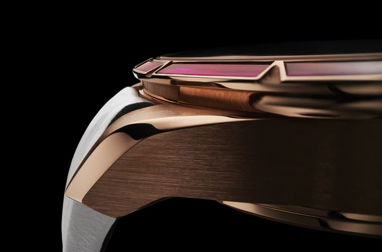 ▲玫瑰金表殼搭配白色表帶并鑲上漸層顏色的尖晶石,賦予手表高雅華麗個性。