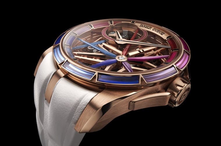 Excalibur Blacklight Spin-Stone Monobalancier採用Eon-Gold玫瑰金制成,搭配白色小牛皮表帶呈現出高雅個性,且一如羅杰杜彼近年的新作,表款同樣配置表帶快拆系統,表主若想更換其他表帶只需靠自己,簡單幾個動作就能順利完成換表帶的目的。
