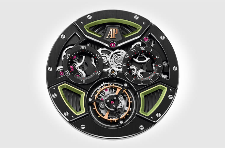 透明底蓋下方的2967自動機芯,以多達536枚零件建構包含飛行陀飛輪與飛返計時等復雜功能,機芯的重點規格如3Hz震頻與65小時動力儲存都是水準以上的設定,其鏤空自動盤也精心鍍上黑色,以與機芯夾板的黑色調呼應,加上手表的背面又都是黑色陶瓷材質,造就整體感強烈的視覺效果。而在表背還會注意到表款採用AP近年新開發的表帶快拆系統,其具有雙重推鎖裝置能讓佩戴者戴表時更感安心,且表款除了出廠時配置的綠色橡膠表帶,品牌也會額外附上一條黑色橡膠表帶,讓表主能夠比較兩種顏色的表帶哪一款更適合自己,或是隨興進行更換。