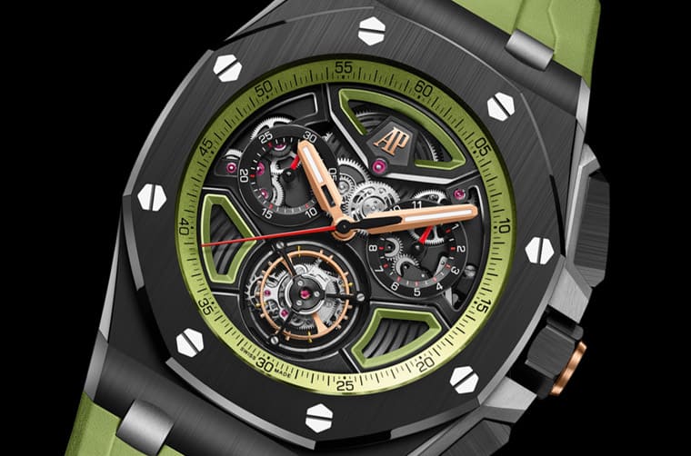 新款皇家橡樹離岸型飛行陀飛輪自動計時碼表面盤邊緣的分鐘刻度環,經過陽極氧化處理形成亮眼的綠色,包括開面設計面盤局部的夾板也同樣以陽極氧化技術鍍上綠色,搭配經過PVD處理的黑色鈦金屬夾板,形成比前作更具沖擊感的視覺印象。而且品牌也特地使用18K玫瑰金打造12點方向的AP Logo、時分指針與表冠頂部等零件,黑-綠-金的色彩組合,相當符合ROO系列一直以來的大膽風格。