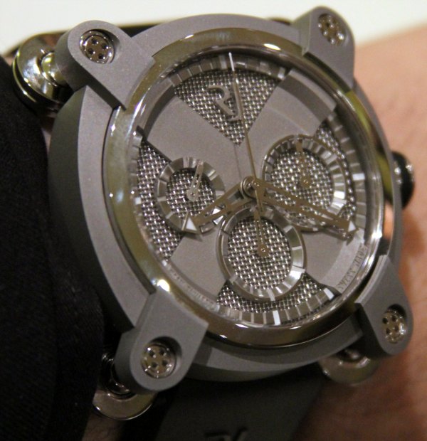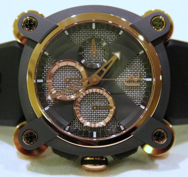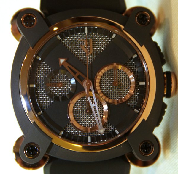 正如我所說,月球入侵者看起來像一個(gè)小型著陸器,腳很小。雖然最前衛(wèi),但表殼實(shí)際上看起來很整潔,細(xì)節(jié)令人印象深刻。表殼寬 46 毫米,但考慮到穿過中心和腳部的 RJ“X” 圖案的延伸,感覺更大。雖然很舒服。真的沒有其他手表看起來像這樣。表盤以網(wǎng)狀金屬開始。這應(yīng)該受到實(shí)際月球著陸器車輛的輪胎胎面的啟發(fā)。無論它的靈感來自什么,它看起來都很光滑,我認(rèn)識(shí)的其他人都沒有這樣做。