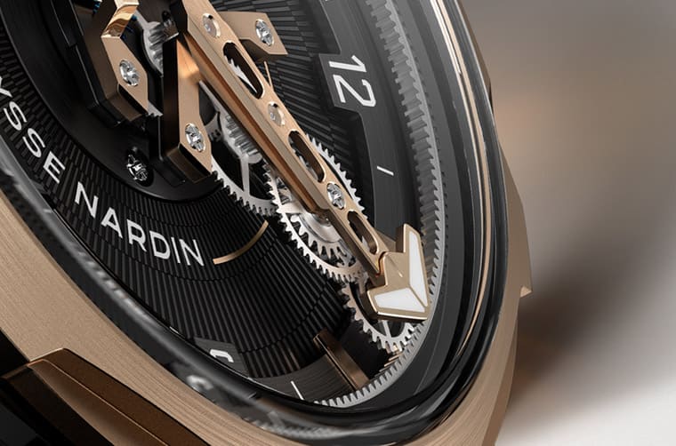 ▲承載整個輪系的飛行卡羅素裝置1小時自轉(zhuǎn)一圈,雅典表替其加上箭頭取代分針顯時。