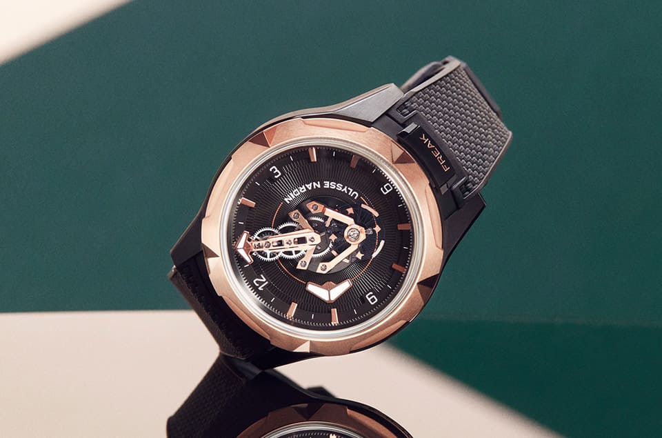2023年雅典表為了致敬奇想系列的起源,創(chuàng)造出Freak One這款作品,它依舊延續(xù)初代作品的三無設(shè)計,表殼則以鈦金屬搭配玫瑰金表圈組成,細看手表外觀,可以找出許多系列前作的影子,例如初代Freak手表的凹陷式表圈、2013年Freak Cruiser奇想巡洋艦手表的開放式齒輪系,還有2018年Freak Vision奇想創(chuàng)見手表那種清楚直覺的時間顯示設(shè)計。就連黑色鈦金屬表殼搭配玫瑰金表圈的組合,也和2022年的Freak S有曲同工之感。