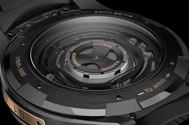 ▲UN-240機芯蘊含品牌專利的Grinder?磨床式上鏈系統(tǒng),可敏銳捕捉手腕任何細微的動作,將其轉(zhuǎn)化為能量。其特別之處在于自動盤連接一個含有四個棘爪的框架,使其能量傳輸效率可達一般自動上鏈系統(tǒng)的兩倍。