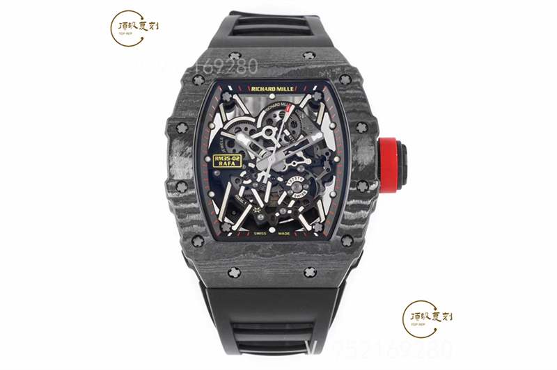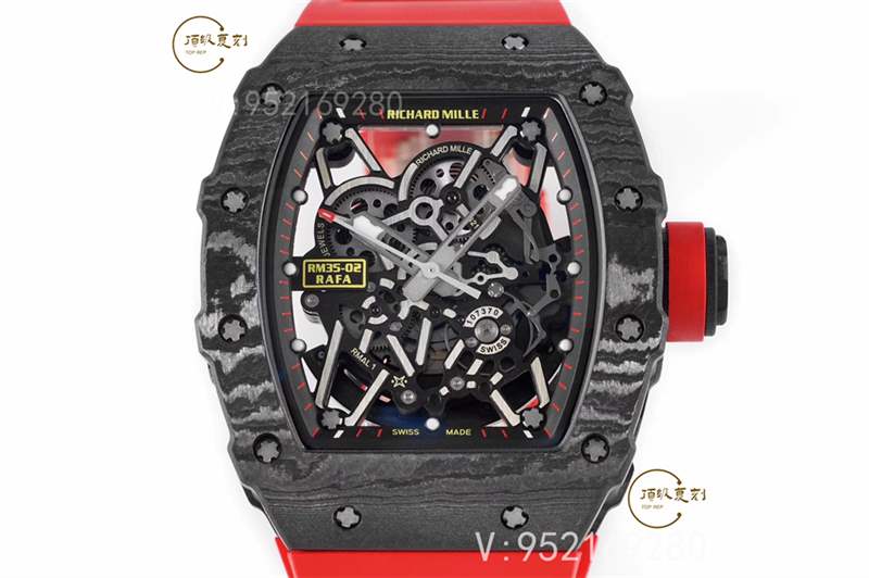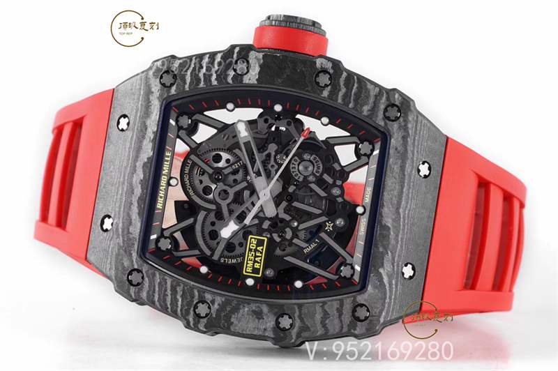 整體腕表理查德RM35-02腕表直徑44x50mm毫米,表殼采用獨家研發的新型材料NTPT碳纖維特別材質,表帶材質為RM專用橡膠表帶,表扣為折疊扣,最高硬度的藍寶石水晶玻璃材料及雙面鍍藍膜處理。整體外觀更偏向于運動化,復雜化,同時做工細節非常到位!