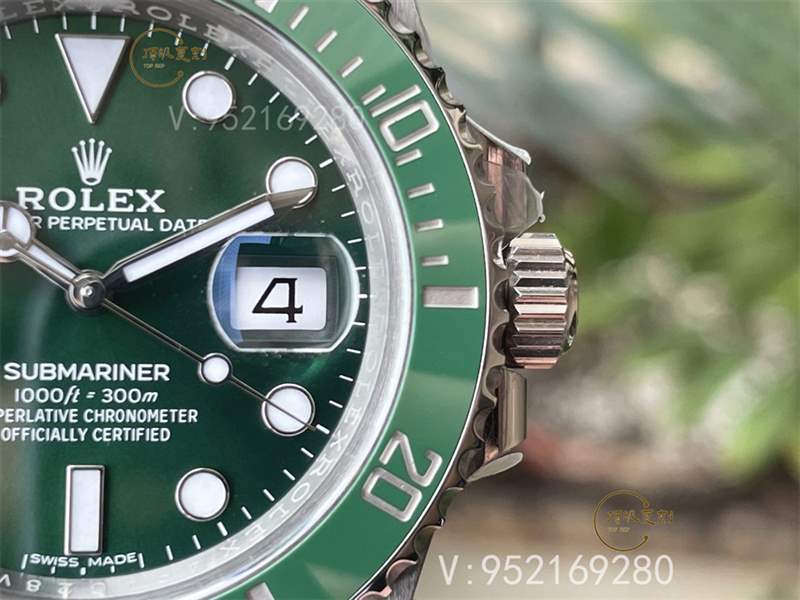 圈口:獨家clean v4版本的設計亮點就在綠色的把握上,和原裝圈口拿著對比,基本上沒有色差,是清脆的金綠色,?陶瓷圈夜明珠,是溫潤如玉夜光珠,不是死白色的,?clean陶瓷圈+夜光珠完美復刻原裝的?。像C廠的陶瓷圈夜明珠凸起剛剛好、是平整的不會高出來很多,別的廠夜明珠凸起高很多,如果夜明珠凸起來高很多是不對版,所以大家可以通過夜明珠去分辨。單向旋轉的陶瓷圈口,聲音非常的清脆。轉動一圈是120個卡槽點,可以根據聲音去判斷。還有一個重要的細節點,夜明珠對準12點位置,向左旋轉10下(根據聲音來判斷),夜明珠的位置一定是停在十一點刻度位置。