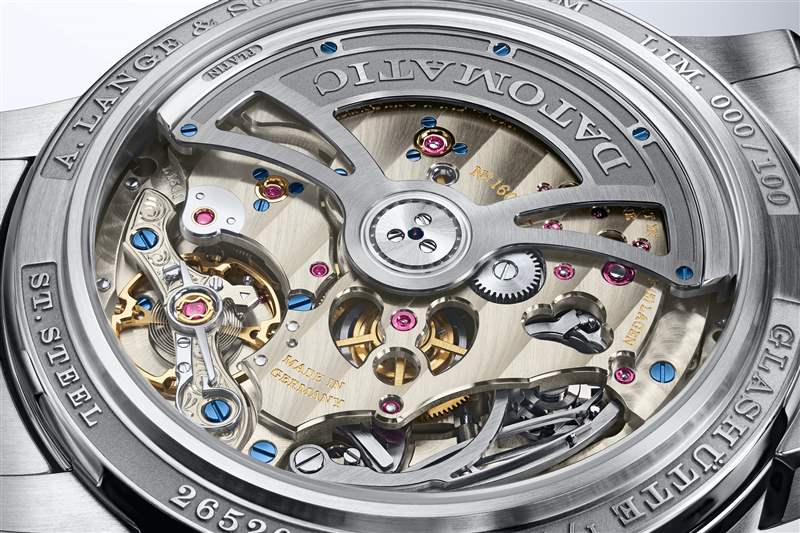 現在介紹全新的 L156.1 Datomatic 機芯。橋板和夾板是未經處理的德國銀。擺輪橋是手工雕刻的,金鏈由最藍的螺絲固定。精加工層次,即使是那些不可見的層次,也完全由手工精心完成。它以 4 赫茲的頻率運行,具有內部游絲、帶四個平衡螺絲的抗震擺輪和 50 小時的動力儲存(如果這更重要的話)。該機芯具有 516 個獨立組件。這不一定是質量的晴雨表,但相比之下,百達翡麗的自動上弦器CH 28-520C有 308。AP的口徑 4401 有 38?1,而VC 的口徑 5200 有 263.?另一方面,這里提到的這三款機芯都比朗格的新機芯薄了一些。?廣告