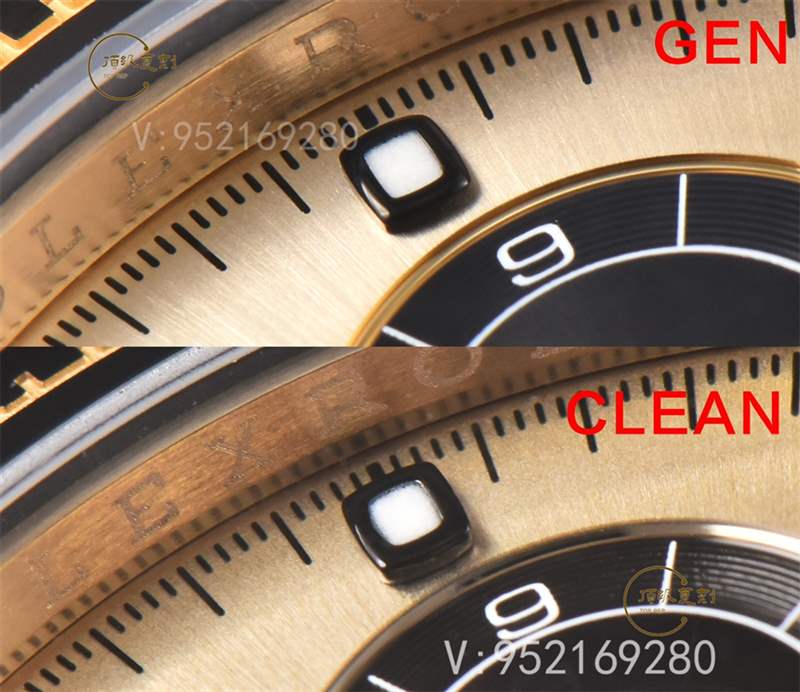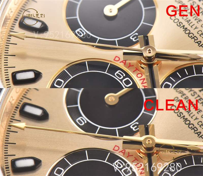 在字面方面來說,此次CLEAN廠進行了重新定義,顏色方面也是極致的達到金色為主,同時對于顏色方面也是進行了真空pvd電鍍,并非普通的噴油調色,pvd好處在于電鍍層可以控制在2-4um微米。不以及計時小眼圈的中間黑色大陽紋以及邊緣d紋完全按照真品一比一開模,對于整體細節方面也是做的很靠譜!