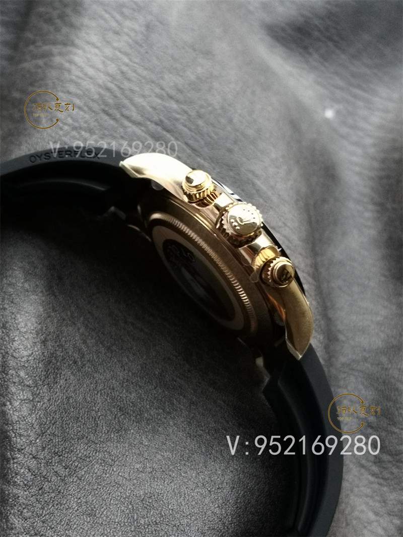 還有就是重量了,我們都是到貴金屬都是比鋼要重的,畢竟密度大,而正品是實金,采用的是18K金材質,勞力士擁有專屬鑄造所,澆鑄出高品質的18K金合金。透過混入不同份量的銀、銅、鉑金或鈀,可提煉出不同種類的18K金:黃金、粉紅金或白色黃金。所有原料均以高純度的金屬煉成,所以純金的分量還是很重。復刻采用的是精鋼打造,然后在離子電鍍黃金色,看上去顏色是一樣了,不過放在手上掂量分量肯定是有明顯的區別。C廠余文樂的重量在145g左右。