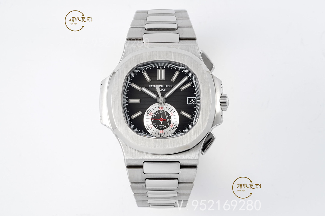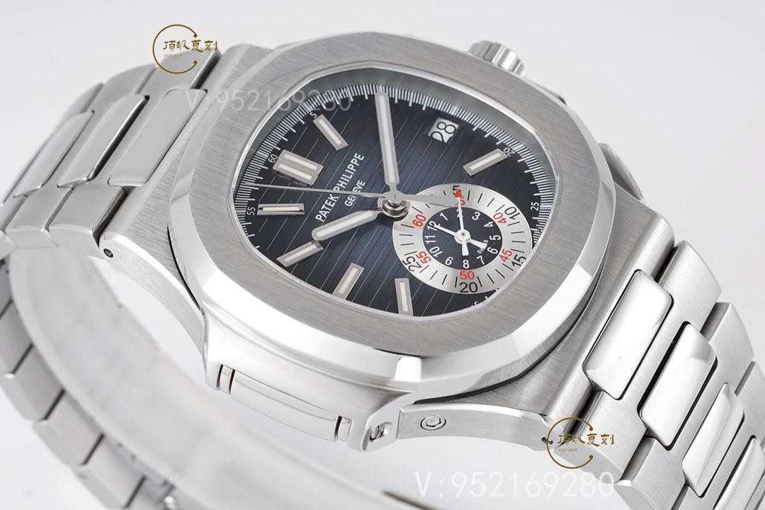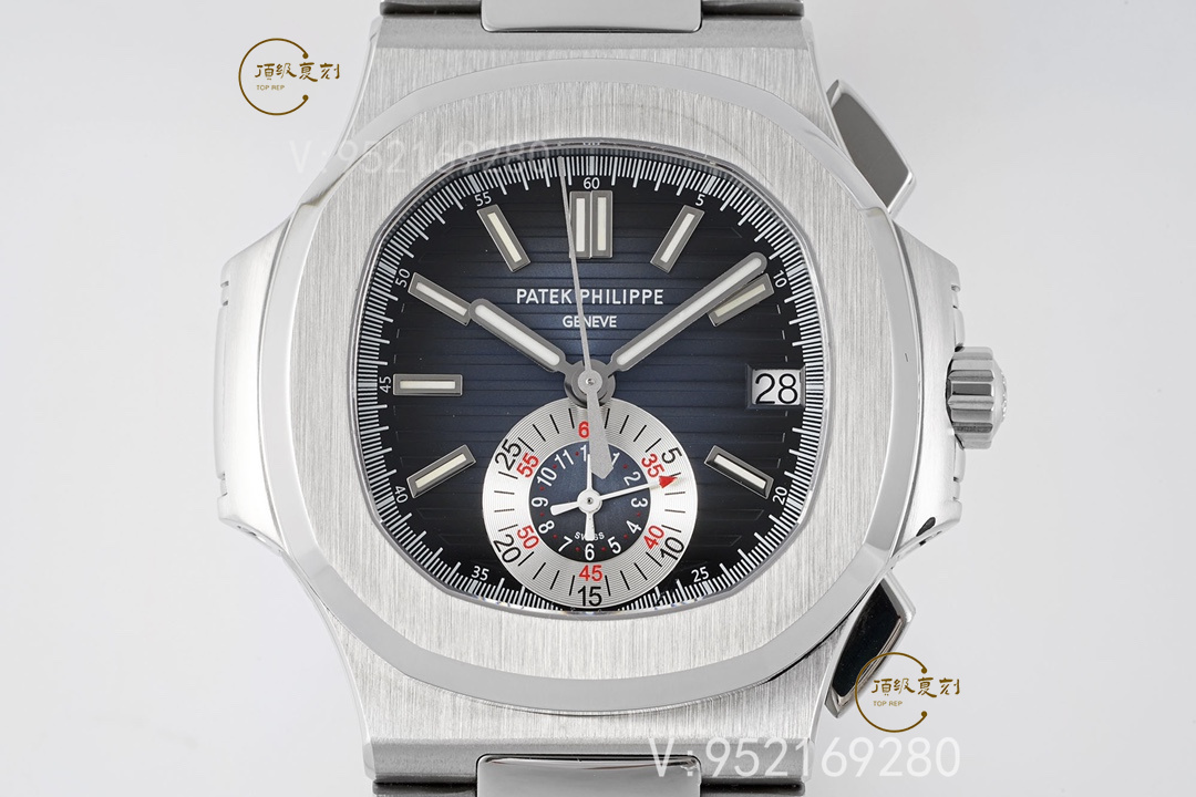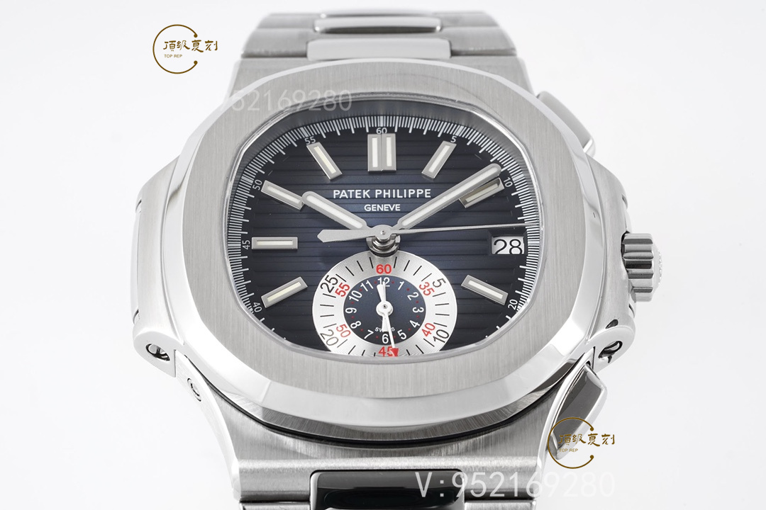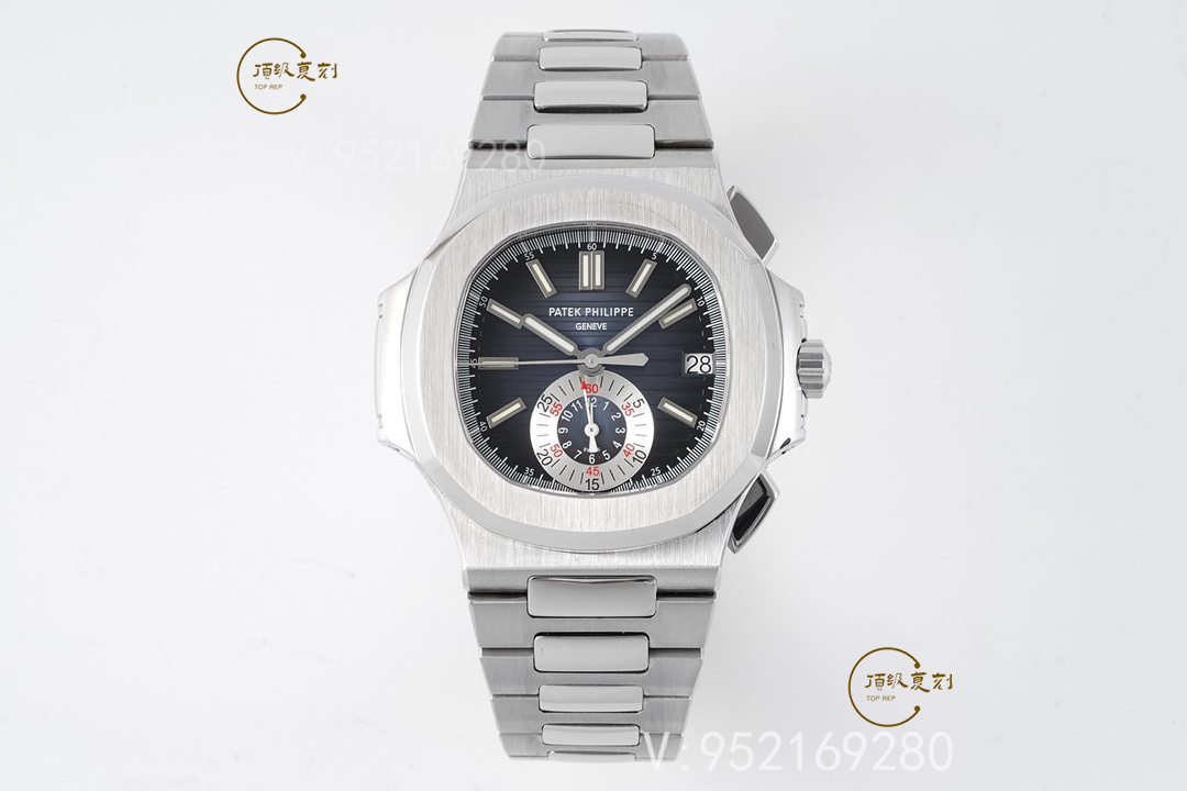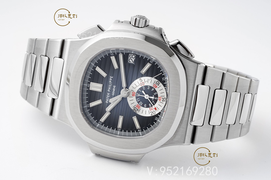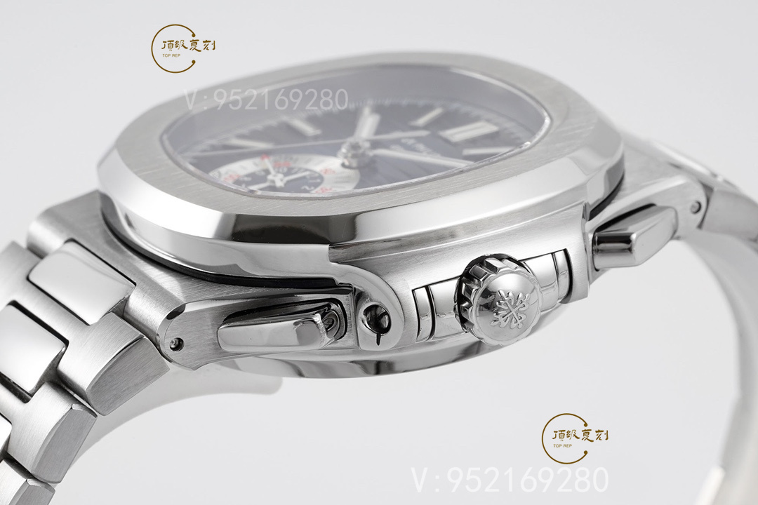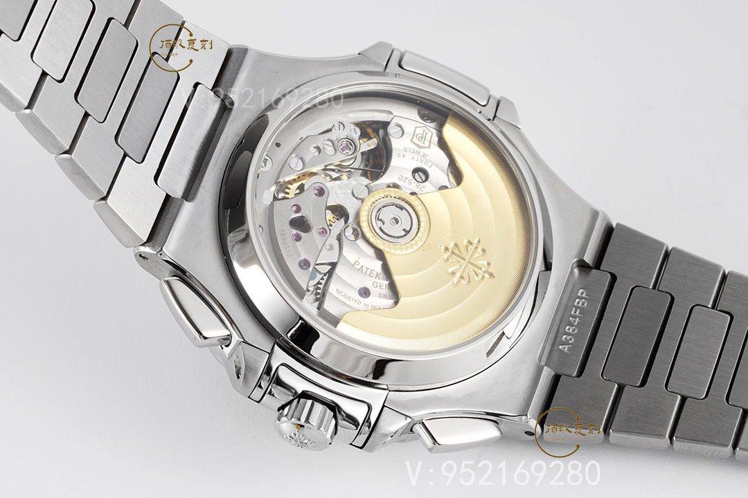 表王百達翡麗的計時表可以這么說,基本做不出功能一樣的機芯,這里簡單介紹一下這款原裝表的各種:5980的厚度為12.6毫米,比其他所有Nautilus系列的都更加厚重。5980/1A使用的是百達翡麗自產的新款28520機芯,該機芯采用21K金中央自動盤單向上弦,寶璣擺輪游絲和四臂Gyromax平衡機,每小時擺次為28,800。動力儲存為45小時,計時碼表按鈕和大部分一樣,2點位的是開始和停止,4點位的是手動復位和飛返。可以說它是市場上最精致運動計時碼表之一。