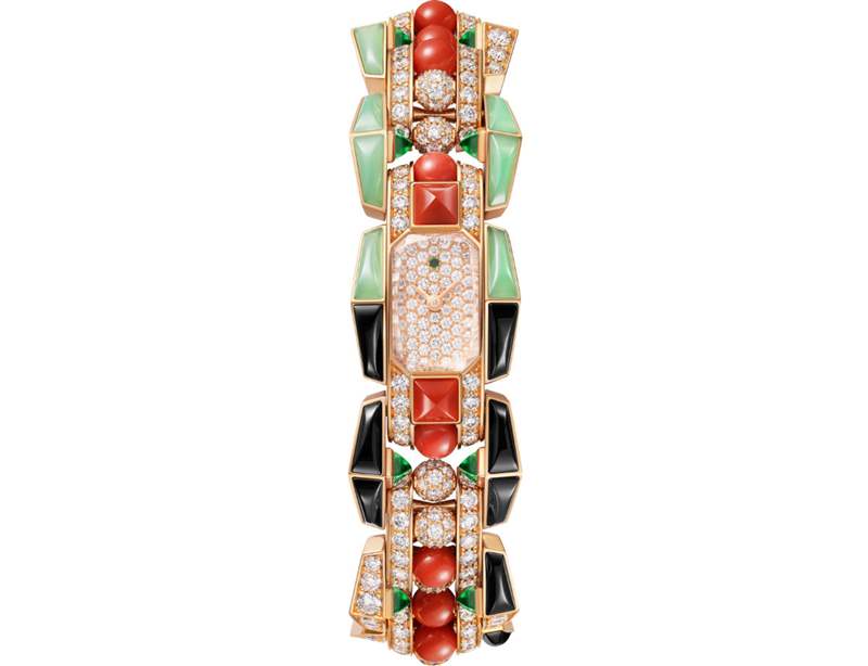 表殼尺寸18.4×32.7mm,采用玫瑰金制作,鑲嵌尖晶石、珊瑚、綠玉髓、沙弗萊石和圓形明亮式切割鉆石。搭載石英機芯,防水深度約30米。