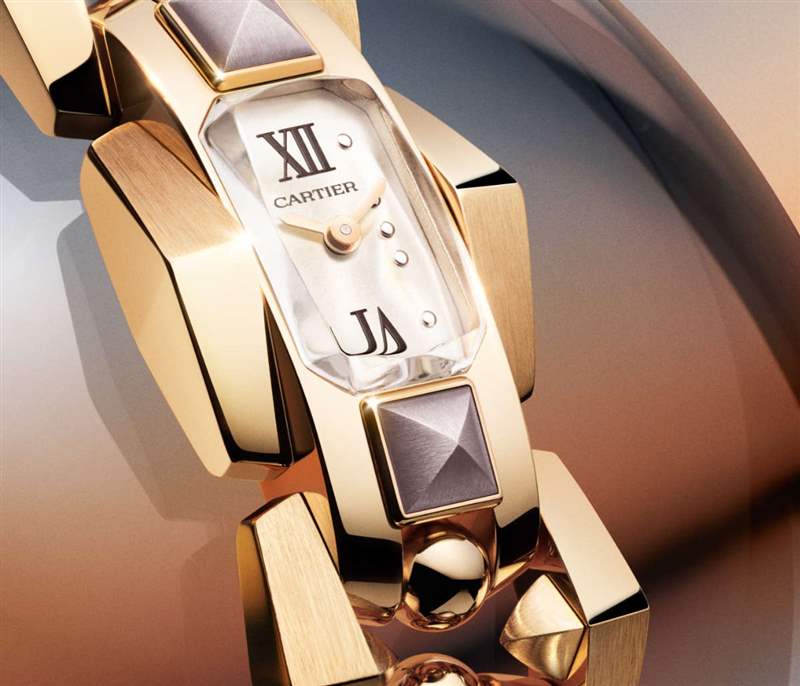 新作表殼采用八角形輪廓,尺寸為18.4×32.8mm,設計特別之處是表鏈幻化成滾珠軌道——表殼上下兩端裝飾一枚金字塔形方釘,滾珠卡嵌于鑲軌中自如轉動。表鏈兩側構成立體梯形鏈節,鉸接結構設計完美貼合手腕線條。