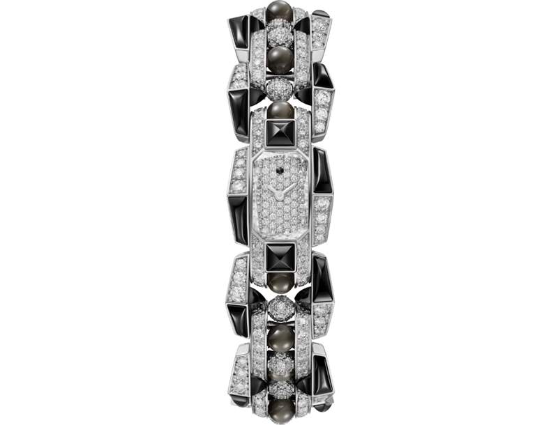 表殼尺寸18.4×32.7mm,采用白金制作,鑲嵌尖晶石、黑曜石和圓形明亮式切割鉆石。搭載石英機芯,防水深度約30米。