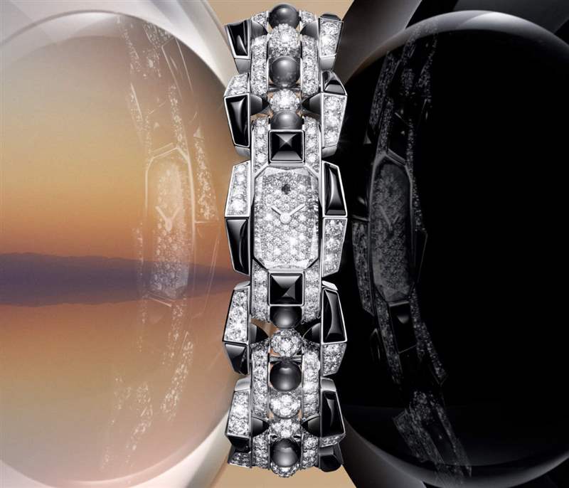寶石和金屬提供3種不同材質版本——「貴金屬」運用黃金、玫瑰金和優雅的紫金搭配,表面經過拋光或拉絲處理,營造出流動閃耀的金質光影;「鉆石」運用白金為主材質,全鉆石版本展現璀璨火彩;或是運用鉆石和黑曜石、黑色尖晶石搭配,黑白色調頗具對撞美感。