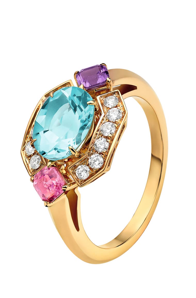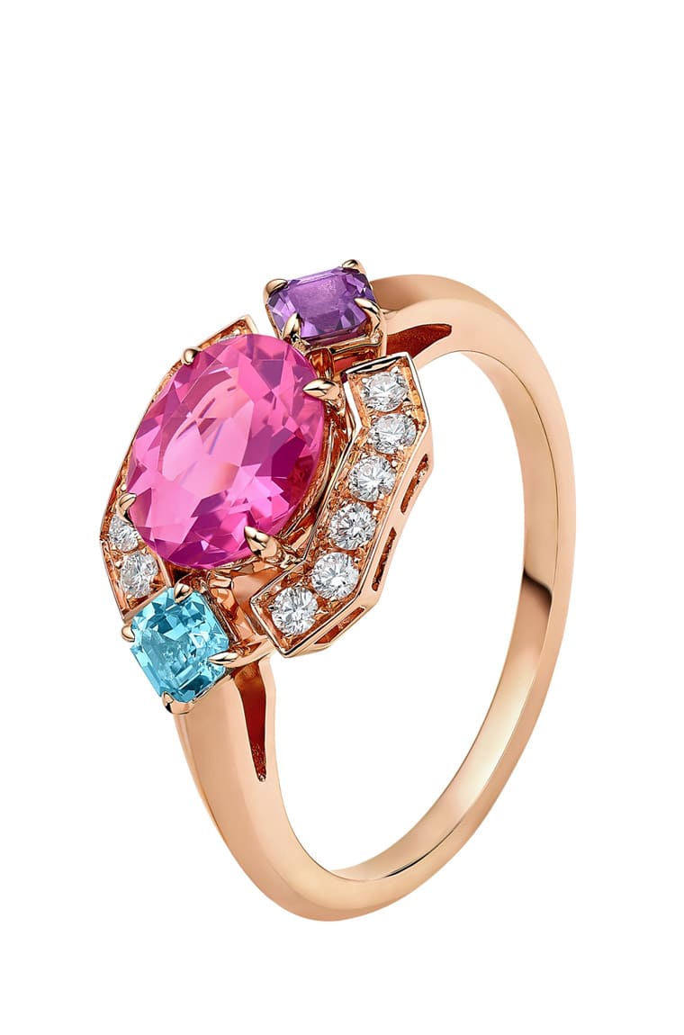 Allegra系列有一款項(xiàng)鏈鑲嵌紫水晶、黃水晶、橄欖石與藍(lán)色拓帕石,在玫瑰金幾何元素環(huán)繞之中,明亮切割鉆石端坐于所有角落,18顆彩色寶石得以歡欣的姿態(tài)與微妙的美感,呈現(xiàn)充滿興味的作品。