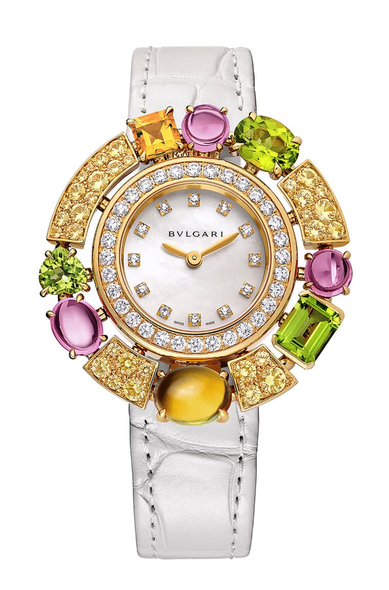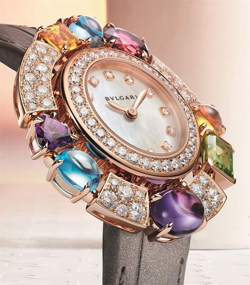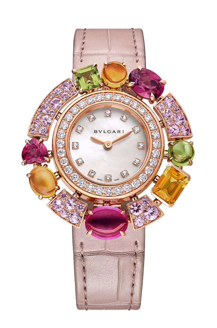 Allegra系列不只有珠寶作品,寶格麗亦將「時(shí)間即珠寶」的理念帶入生活,打造最新的雞尾酒珠寶腕表。腕表將碧璽、黃水晶、玫瑰榴石和橄欖石,以各種充滿歡樂(lè)的造型呈現(xiàn),并搭配粉色或黃色剛玉點(diǎn)綴,持續(xù)以率性歡快的質(zhì)感吸引女性目光,宛如手腕上綻放的嬌艷花朵垂涎欲滴,讓人一見傾心。