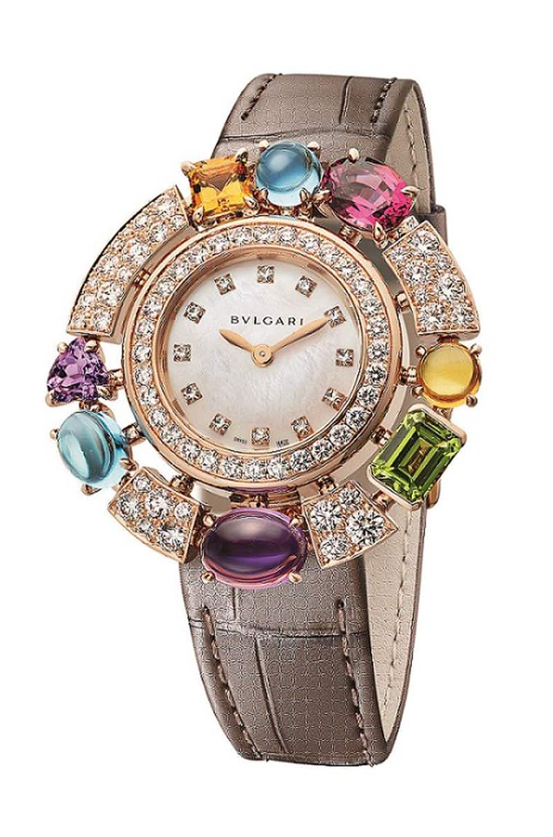 玫瑰金表殼鑲飾82顆圓形明亮切割鉆石、1顆祖母綠切割橄欖石(重約1.29克拉)、2顆蛋面切割藍(lán)色拓帕石(總重約3.06克拉)、1顆橢圓形切割玫瑰榴石(重約1.63 克拉)、2顆蛋面切割與祖母綠形切割黃水晶(1.45 克拉)、2 顆心形、橢圓形切割紫水晶(總重約3.06 克拉)。