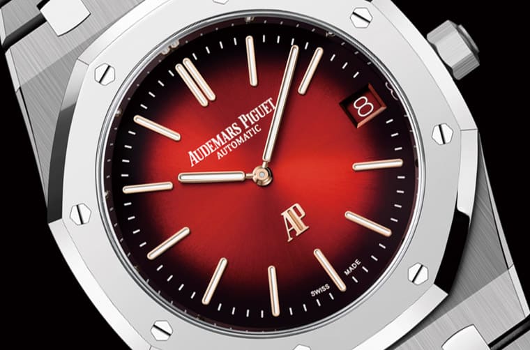 除了表殼材質(zhì)比較特殊之外,16202XT的面盤顏色也有令人耳目一新的改變,愛彼采用紅色漸層太陽紋修飾,舍棄了系列傳統(tǒng)的Tapisserie格紋,3點方向的日期轉(zhuǎn)盤也呼應(yīng)面盤顏色采紅底白字設(shè)計;另外包括6點方向的AP Logo、時標(biāo)與指針等則以玫瑰金制成,由此挹注一股低調(diào)的奢華貴氣。如此耀眼的紅色系之前在皇家橡樹系列中也不多見,可是在新款加入后,目前在品牌官網(wǎng)上已經(jīng)找不到之前的漸層綠面鉑金款16202PT,似乎也默默地進行了交棒的工作。