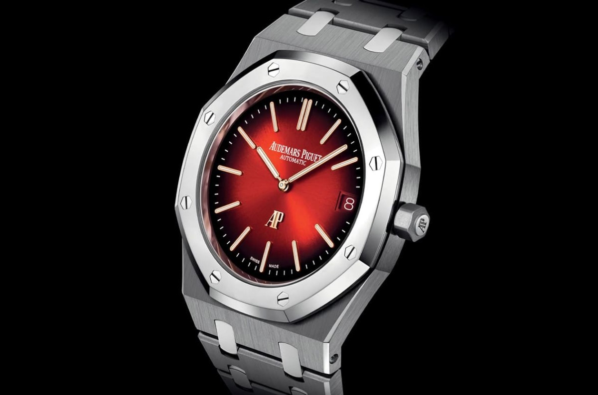 ▲16202XT的表殼、鏈帶零件為鈦金屬制成、表圈與錬節(jié)連接零件則是用BMG材質(zhì)打造,后者采用拋光處理為皇家橡樹Jumbo超薄表少見設(shè)計,包括漸層紅色面盤也是系列中少見的嘗試。