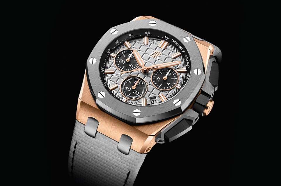 ▲43mm皇家橡樹離岸型自動(dòng)上鏈計(jì)時(shí)碼表還有玫瑰金配鈦金屬的組合,灰色格紋面盤點(diǎn)綴玫瑰金時(shí)標(biāo)、指針零件,華麗氣息油然而生。