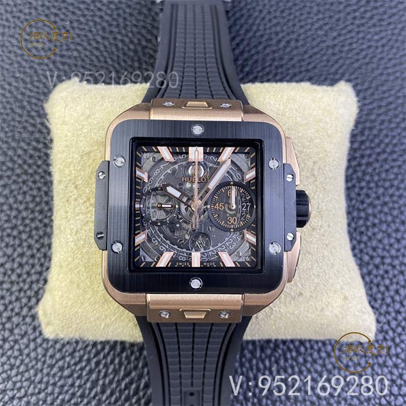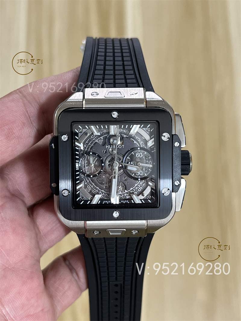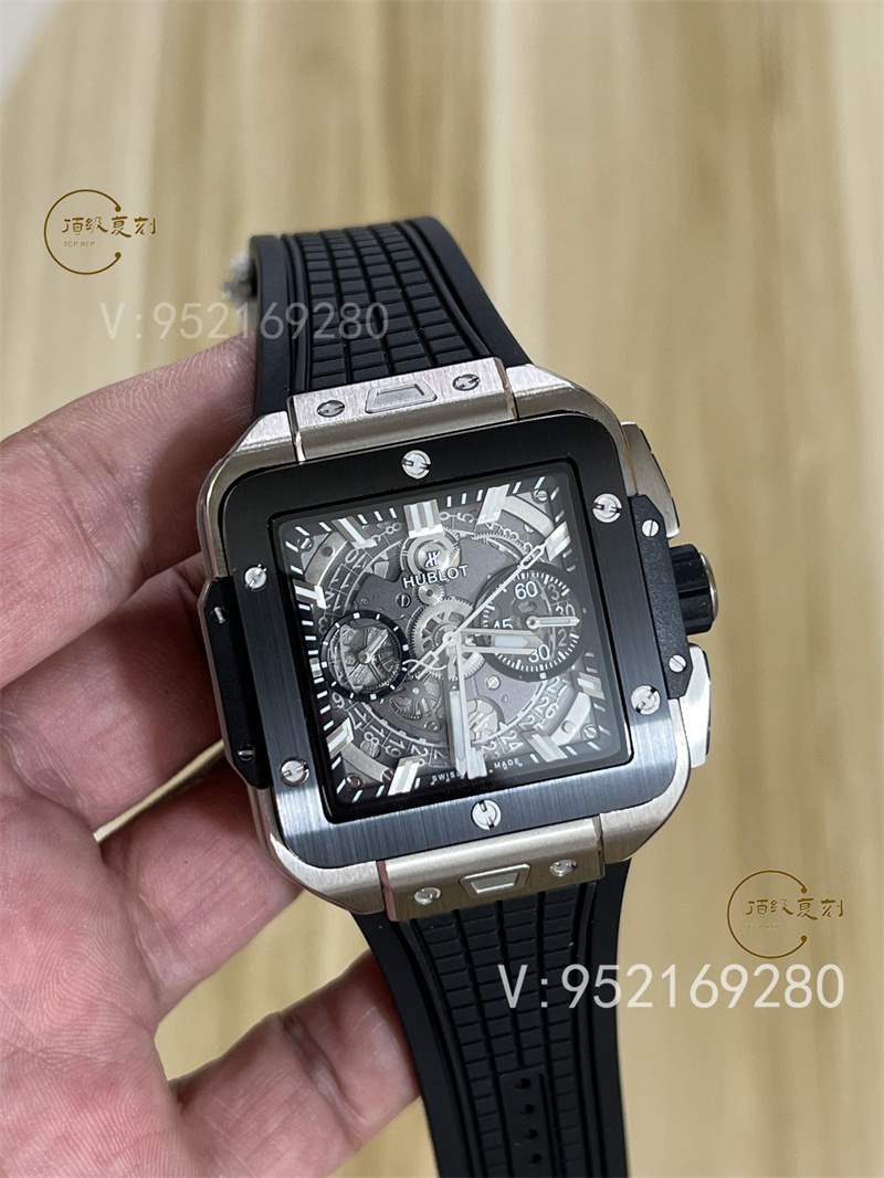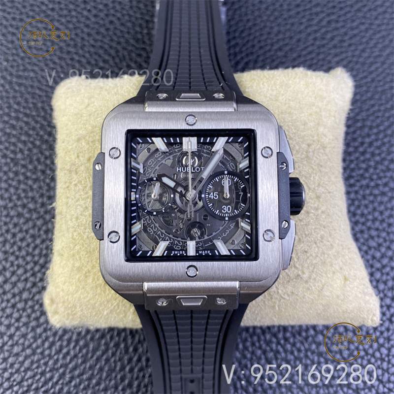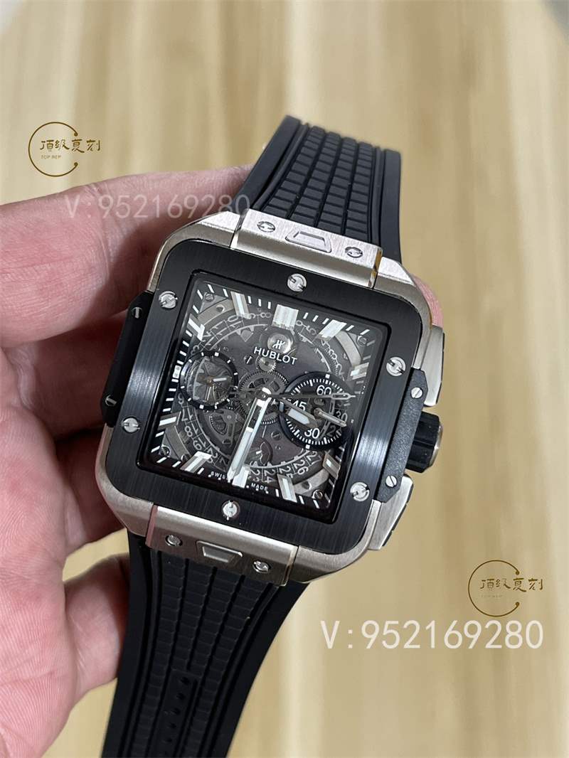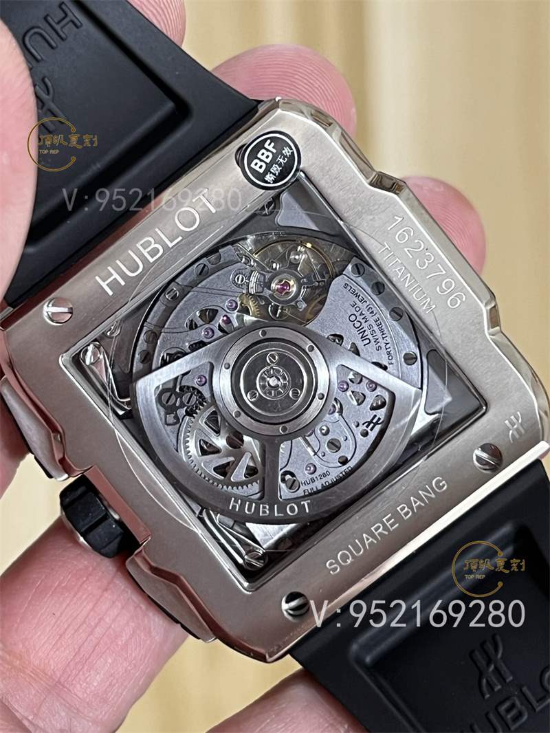 全新核心作品 HB SQUARE BANG UNICO系列,宇舶方形五級鈦金+高透藍寶石字面+一鍵快拆系統,6點鐘位置設有清晰可見的導柱輪,42mm。全透也是方形的設計精品可以說很少,bbf出,zf的宇舶也是這個代工的,做工信心有保證!計時機芯也是7750計時,凡是計時表除了迪通拿之外,復刻表統一7750,看到假表的計時款基本不用再問我什么機芯了。