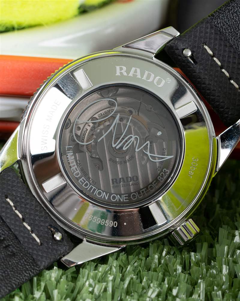 作為限量版,該腕表配備煙熏藍寶石水晶表底蓋,底蓋上印有 Cameron Norrie 的簽名和金屬印花的限量版文字——該腕表限量發行 823 枚,以紀念 Norrie 的 8 月 23 日生日。印刷是這樣的,只有在光線照射下你才能看到清晰的視野,我更喜歡不那么神秘的“永遠在線”的替代方案。透過表背,您可以看到基于 ETA C07.611 的 Rado R8763 自動機芯。這款機芯在斯沃琪集團旗下的其他地方也有使用,例如 Midos 的 Calibre 80 和 Hamiltons 的 H-10。實際上,它是一款已降頻至 21,600 vph 的 ETA 2824-2,可提供 80 小時的動力儲存。在我坐下來寫這篇文章的那天,我在離開幾天后拿起手表戴上,并驚喜地發現它仍然準時運行。