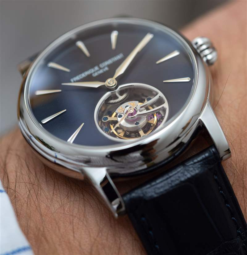 巨大的指針以其體積、復雜的形狀和明顯的縱向彎曲給人留下了深刻的印象。它們也是 FC-980 自產機芯的力量展示,該機芯不僅承載著巨大的時針和分針,還承載著陀飛輪組件。動力儲存只有區區38小時,很短,但至少是自動補充的。FC-980機芯調校為熱、冷、等時、三方位,但沒有說明是否是經過認證的天文臺表。