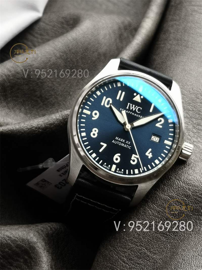 對于此次腕表字面方面來說,此次腕表在顏色方面就有黑色,綠色以及藍(lán)色這三個顏色,當(dāng)然此次顏色方面也是去還原了原版細(xì)節(jié),此次V7廠也是捷足先登了,繼馬克18后,此次20的開模,也讓腕表達(dá)到了全新的設(shè)計風(fēng)格!刻度和時標(biāo)依然保持白色印制工藝,與馬克18的區(qū)別增加了3、6、9、12時標(biāo)的長度,夜光條變化成夜光圖層,阿拉伯?dāng)?shù)字時標(biāo)則整體向表盤中央靠近,12點“IWC”標(biāo)志略微上移,三角刻度也改為水滴夜光呈現(xiàn)全新的視覺比例。